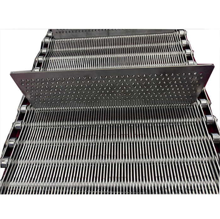 The eye links are welded on to an location wire, so that a module is created. Very narrow and very wide openings can be created, depending on the processing of the products concerned.The underwelded wire eliminates the potential bacteria traps under the spacers, springs, rings, and sleeves. This configuration makes cleaning and sanitation easy and more efficient.